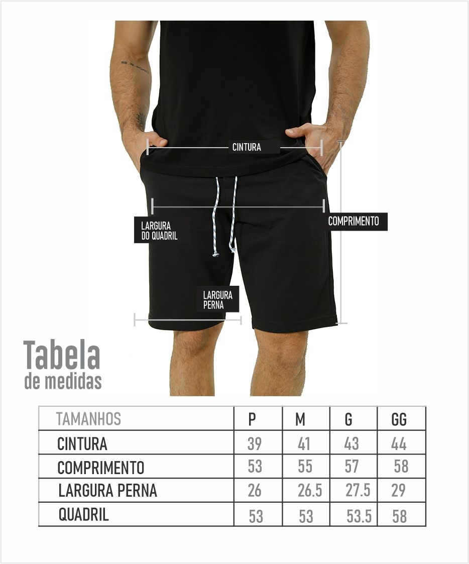 | Cores Bermuda Moletom | CAQUI, CHUMBO, CINZA, PRETA |